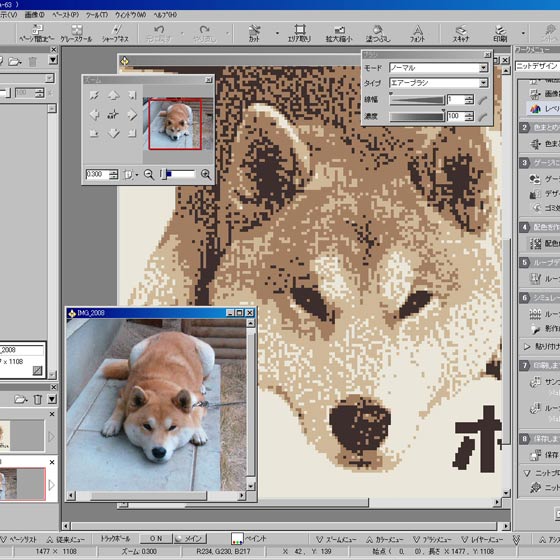 お写真を頂いたら、このようにひとりずつデザインしていきます。専用のCADで写真を皆がら描きます。ひとつのドットが編み物の1目になります。